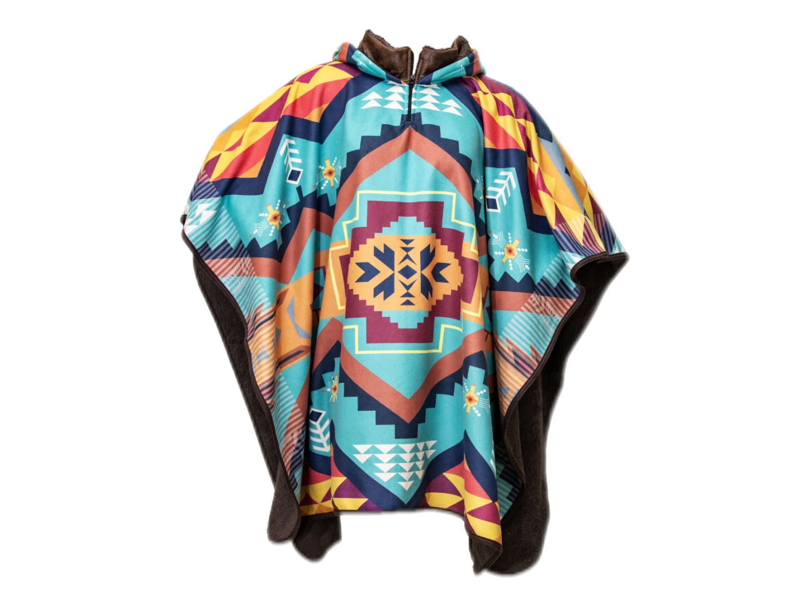 Poncho azul agua, con detalles en forma de rombo y líneas en zig-zag en tonos azul marino, naranja y rojo, por ambos lados. Tela con un tacto suave en su cara externa e interior de borreguito. Cuenta con capucha y la zona del cuello tiene acabados con simulación de cuero y cierre para mayor comodidad. Acabados del poncho cosidos para evitar hilos sueltos. Talla única y unisex (tanto para hombres como mujeres) para adultos. Materiales de alta calidad. Perfecto para temporadas de frío, mantiene el calor además de mantener su aspecto inicial después de los lavados. Un estilo de poncho diferente a los tradicionales pero manteniendo sus raíces. Hecho en Ecuador.